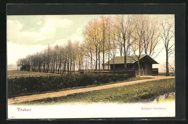 AK Trebon, Partie am Feldrand, alte Holzhütte