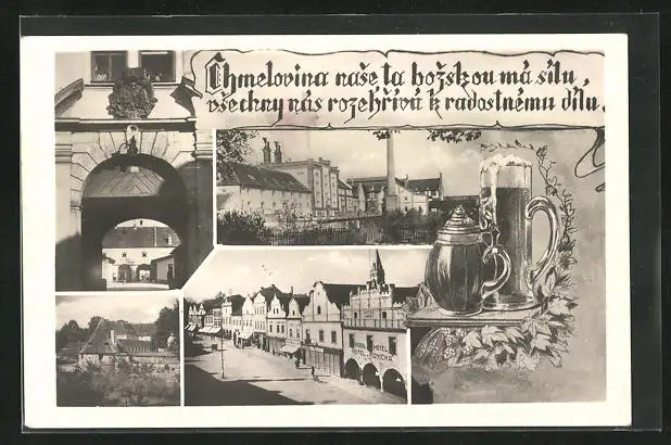 AK Trebon, Strassenpartie mit Hotel, Tor, Denkmal