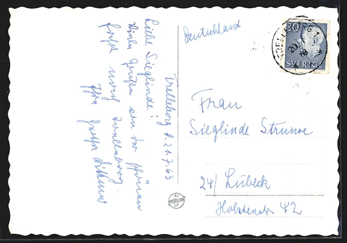 Personenbezogene Daten auf der Rückseite der Karte wurden durch blauen Textmarker unkenntlich gemacht. Die blauen Stellen sind auf die Vorderseite durchgeweicht und wirken sich negativ auf das Postkartenfoto aus