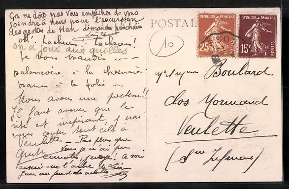 Personenbezogene Daten auf der Rückseite der Karte wurden durch blauen Textmarker unkenntlich gemacht. Die blauen Stellen sind auf die Vorderseite durchgeweicht und wirken sich negativ auf das Postkartenfoto aus