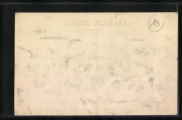 Personenbezogene Daten auf der Rückseite der Karte wurden durch blauen Textmarker unkenntlich gemacht. Die blauen Stellen sind auf die Vorderseite durchgeweicht und wirken sich negativ auf das Postkartenfoto aus