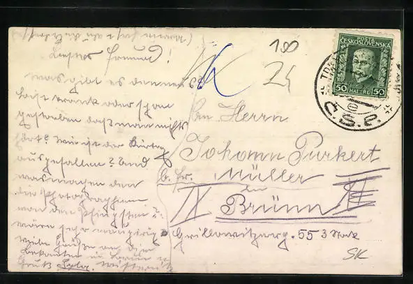 alte Ansichtskarte, gelaufen, vorderseitig Klebe- und Papierreste, guter Zustand