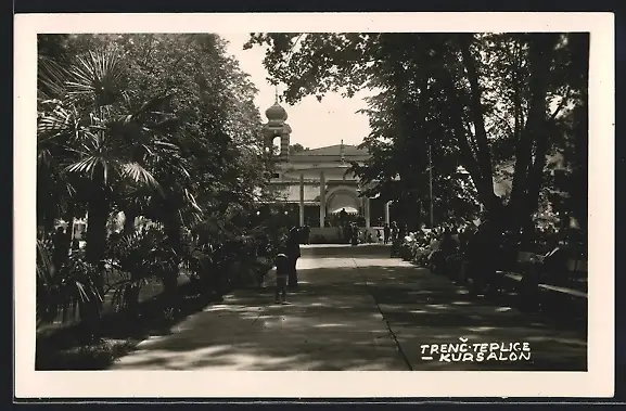 AK Trenc. Teplice, Kursalon, Kurgäste im Schatten von Bäumen