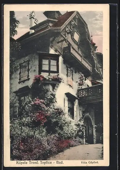AK Trencenteplic, Die mit Blumen geschmückte Villa Göpfert