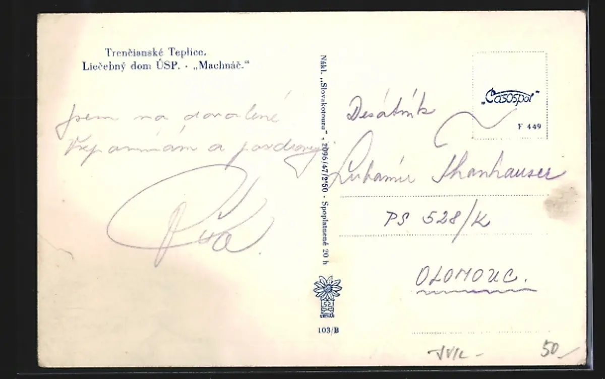Personenbezogene Daten auf der Rückseite der Karte wurden durch blauen Textmarker unkenntlich gemacht. Die blauen Stellen sind auf die Vorderseite durchgeweicht und wirken sich negativ auf das Postkartenfoto aus