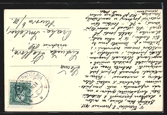 Personenbezogene Daten auf der Rückseite der Karte wurden durch blauen Textmarker unkenntlich gemacht. Die blauen Stellen sind auf die Vorderseite durchgeweicht und wirken sich negativ auf das Postkartenfoto aus