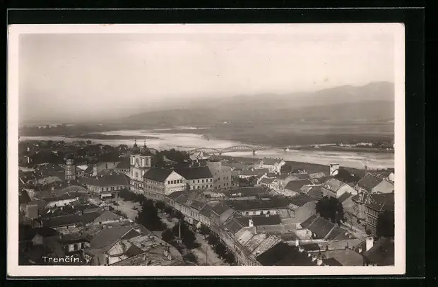 AK Trencin, Teilansicht mit Brücke aus der Vogelschau