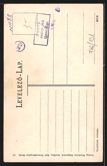 Personenbezogene Daten auf der Rückseite der Karte wurden durch blauen Textmarker unkenntlich gemacht. Die blauen Stellen sind auf die Vorderseite durchgeweicht und wirken sich negativ auf das Postkartenfoto aus