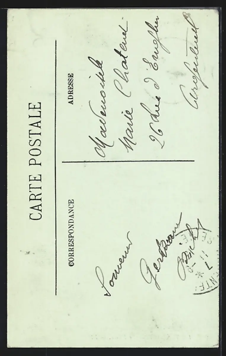 Personenbezogene Daten auf der Rückseite der Karte wurden durch blauen Textmarker unkenntlich gemacht. Die blauen Stellen sind auf die Vorderseite durchgeweicht und wirken sich negativ auf das Postkartenfoto aus
