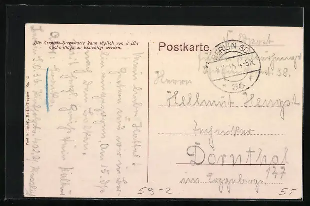 Personenbezogene Daten auf der Rückseite der Karte wurden durch blauen Textmarker unkenntlich gemacht. Die blauen Stellen sind auf die Vorderseite durchgeweicht und wirken sich negativ auf das Postkartenfoto aus
