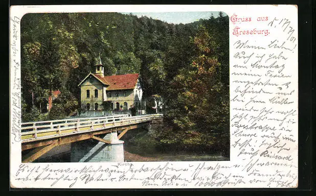 AK Treseburg, Partie mit Kirche und Brücke