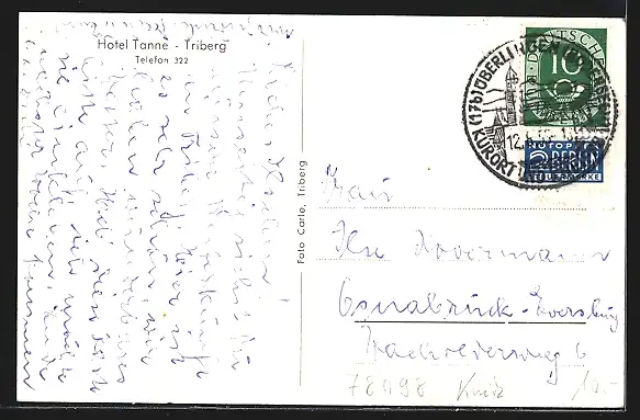 Personenbezogene Daten auf der Rückseite der Karte wurden durch blauen Textmarker unkenntlich gemacht. Die blauen Stellen sind auf die Vorderseite durchgeweicht und wirken sich negativ auf das Postkartenfoto aus