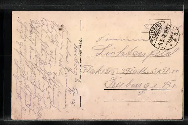 Personenbezogene Daten auf der Rückseite der Karte wurden durch blauen Textmarker unkenntlich gemacht. Die blauen Stellen sind auf die Vorderseite durchgeweicht und wirken sich negativ auf das Postkartenfoto aus