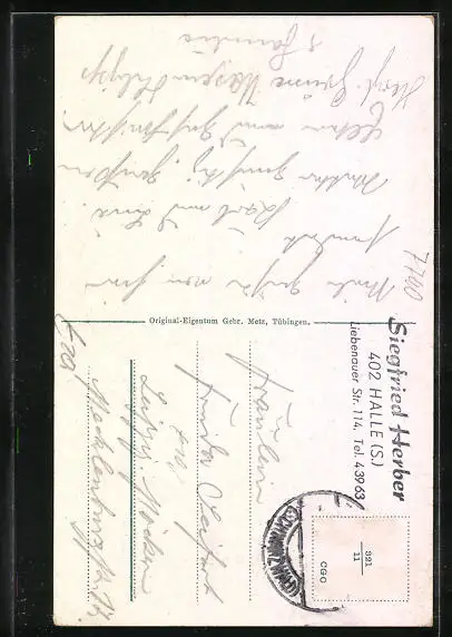 Personenbezogene Daten auf der Rückseite der Karte wurden durch blauen Textmarker unkenntlich gemacht. Die blauen Stellen sind auf die Vorderseite durchgeweicht und wirken sich negativ auf das Postkartenfoto aus