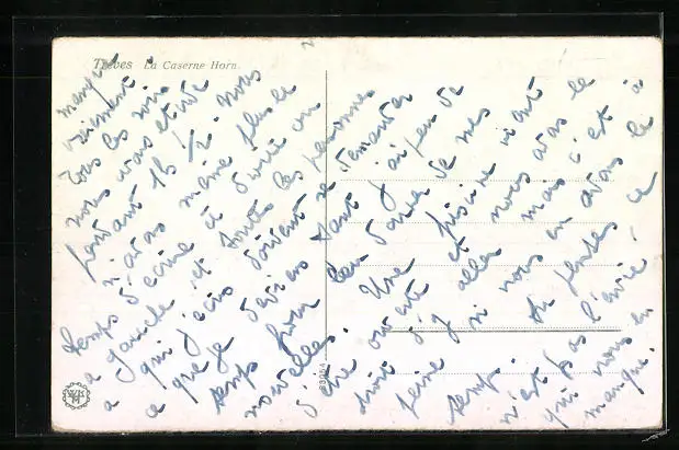 Personenbezogene Daten auf der Rückseite der Karte wurden durch blauen Textmarker unkenntlich gemacht. Die blauen Stellen sind auf die Vorderseite durchgeweicht und wirken sich negativ auf das Postkartenfoto aus