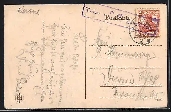 Personenbezogene Daten auf der Rückseite der Karte wurden durch blauen Textmarker unkenntlich gemacht. Die blauen Stellen sind auf die Vorderseite durchgeweicht und wirken sich negativ auf das Postkartenfoto aus