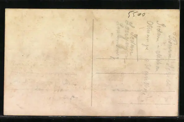 Personenbezogene Daten auf der Rückseite der Karte wurden durch blauen Textmarker unkenntlich gemacht. Die blauen Stellen sind auf die Vorderseite durchgeweicht und wirken sich negativ auf das Postkartenfoto aus