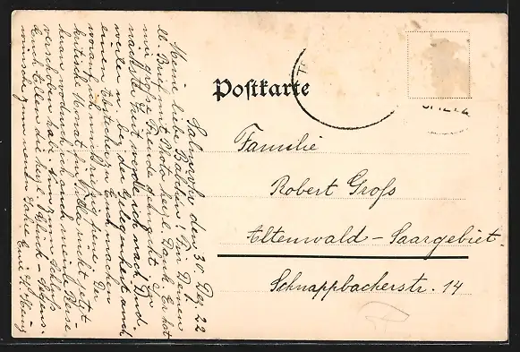 alte Ansichtskarte, gelaufen, Briefmarke entfernt, rückseitig Oberflächenschaden, guter Zustand