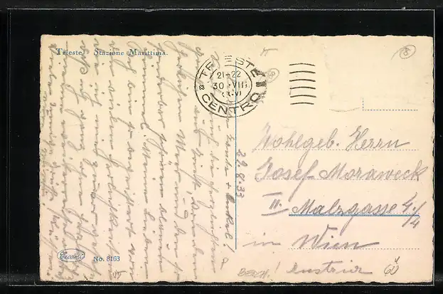 Personenbezogene Daten auf der Rückseite der Karte wurden durch blauen Textmarker unkenntlich gemacht. Die blauen Stellen sind auf die Vorderseite durchgeweicht und wirken sich negativ auf das Postkartenfoto aus
