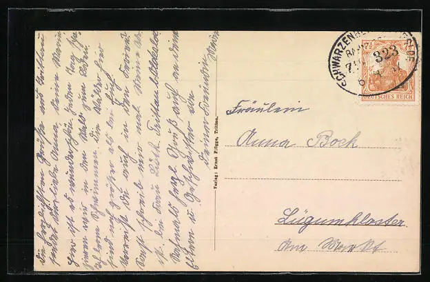 Personenbezogene Daten auf der Rückseite der Karte wurden durch blauen Textmarker unkenntlich gemacht. Die blauen Stellen sind auf die Vorderseite durchgeweicht und wirken sich negativ auf das Postkartenfoto aus