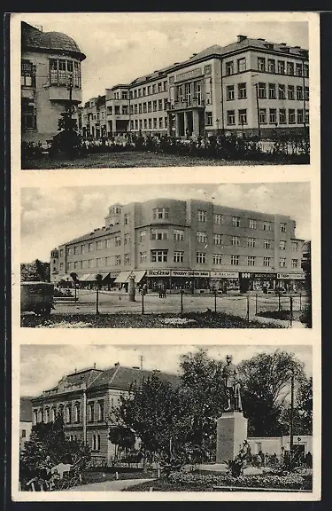 AK Trnava, Strassenpartie mit modernem Geschäftshaus, Kriegerdenkmal