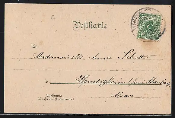Personenbezogene Daten auf der Rückseite der Karte wurden durch blauen Textmarker unkenntlich gemacht. Die blauen Stellen sind auf die Vorderseite durchgeweicht und wirken sich negativ auf das Postkartenfoto aus