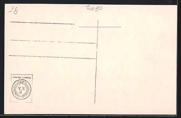 Personenbezogene Daten auf der Rückseite der Karte wurden durch blauen Textmarker unkenntlich gemacht. Die blauen Stellen sind auf die Vorderseite durchgeweicht und wirken sich negativ auf das Postkartenfoto aus