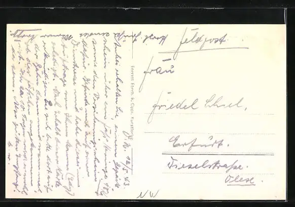 Personenbezogene Daten auf der Rückseite der Karte wurden durch blauen Textmarker unkenntlich gemacht. Die blauen Stellen sind auf die Vorderseite durchgeweicht und wirken sich negativ auf das Postkartenfoto aus