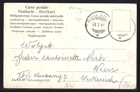 gelaufen 1907, Briefmarke entfernt, guter Zustand