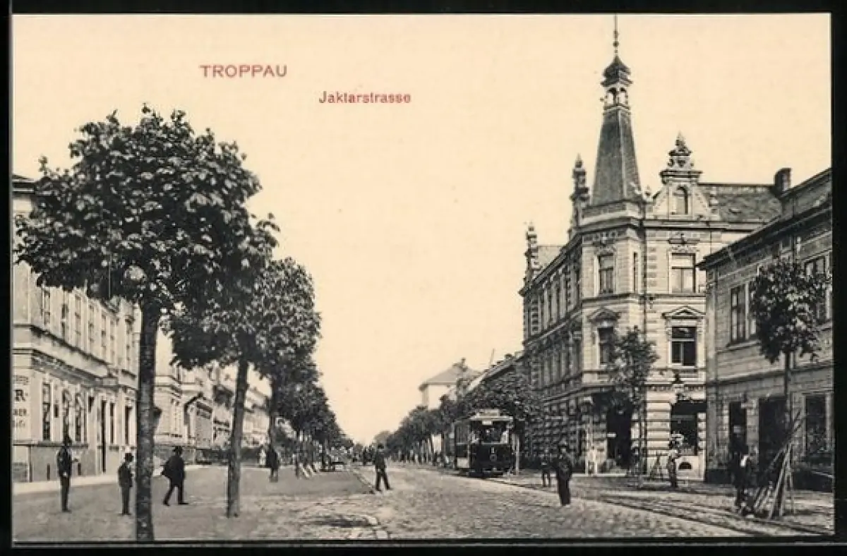 AK Troppau, Jaktarstrasse mit Strassenbahn