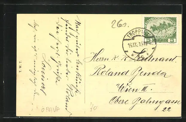 AK Troppau, Oberring mit Geschäft, Stadttheater und Strassenbahn