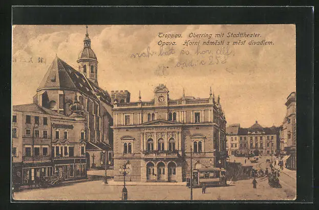 AK Troppau, Oberring mit Stadttheater mit Strassenbahn