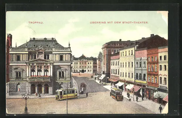 AK Troppau, Oberring mit dem Stadt-Theater und Strassenbahn