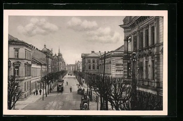 AK Troppau, Olmützerstrasse mit Strassenbahn