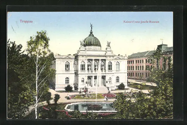 AK Troppau /Opava, Kaiser-Franz-Josef-Museum mit Brunnenfontäne