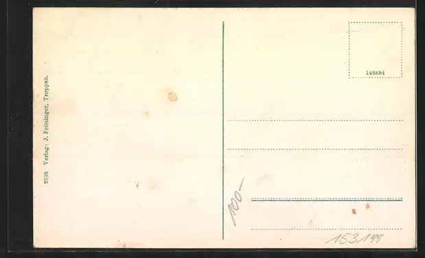 Personenbezogene Daten auf der Rückseite der Karte wurden durch blauen Textmarker unkenntlich gemacht. Die blauen Stellen sind auf die Vorderseite durchgeweicht und wirken sich negativ auf das Postkartenfoto aus