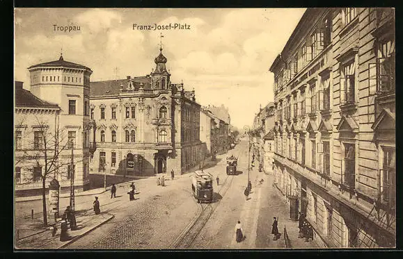 AK Troppau, Strassenbahnen auf dem Franz-Josef-Platz