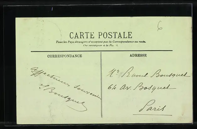 Personenbezogene Daten auf der Rückseite der Karte wurden durch blauen Textmarker unkenntlich gemacht. Die blauen Stellen sind auf die Vorderseite durchgeweicht und wirken sich negativ auf das Postkartenfoto aus