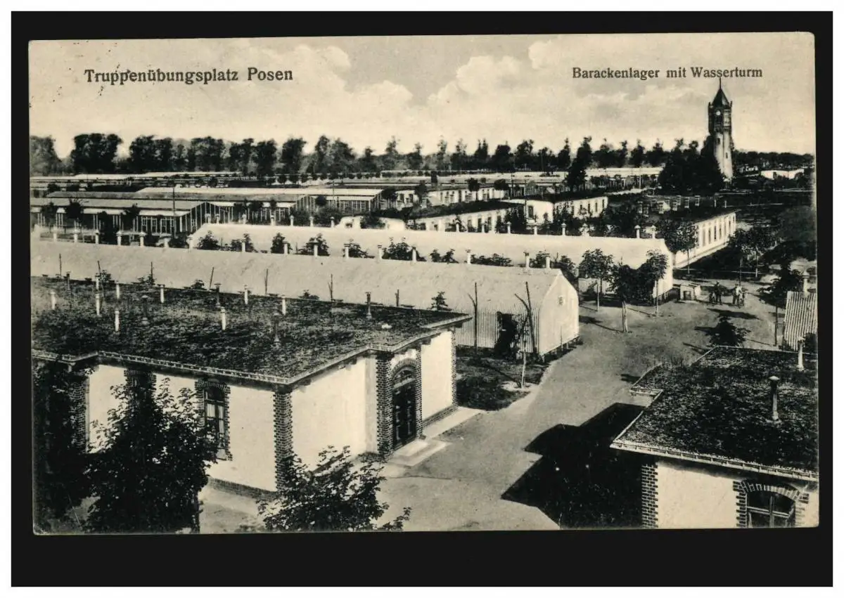 AK Truppenübungslager Posen: Barackenlager mit Wasserturm, WARTHELAGER 3.9.1915