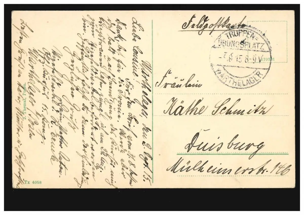 Tagesstempel: TRUPPEN-ÜBUNGSLAGER WARTHELAGER 3.9.15, nach Duisburg