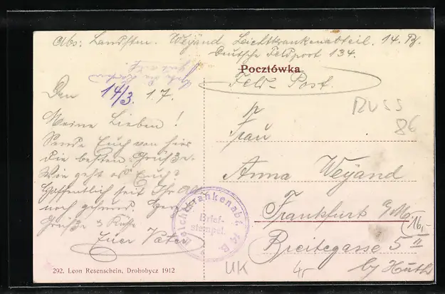 Personenbezogene Daten auf der Rückseite der Karte wurden durch blauen Textmarker unkenntlich gemacht. Die blauen Stellen sind auf die Vorderseite durchgeweicht und wirken sich negativ auf das Postkartenfoto aus