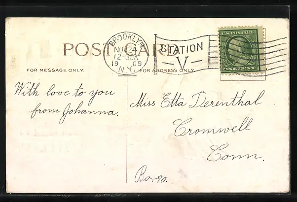 Personenbezogene Daten auf der Rückseite der Karte wurden durch blauen Textmarker unkenntlich gemacht. Die blauen Stellen sind auf die Vorderseite durchgeweicht und wirken sich negativ auf das Postkartenfoto aus