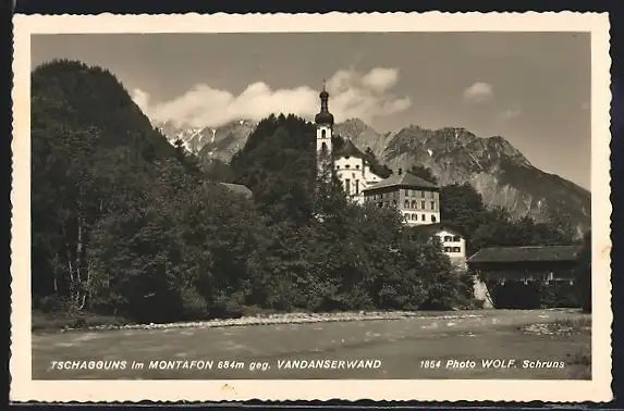 AK Tschagguns im Montafon, Kirche und Gebäude gegen Vandanserwand