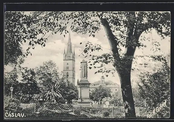 AK Tschaslau / Caslav, Blick auf ein Denkmal und Kirchturm