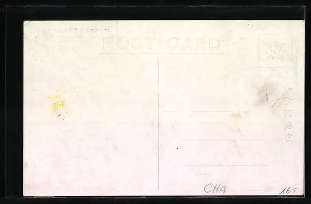 Personenbezogene Daten auf der Rückseite der Karte wurden durch blauen Textmarker unkenntlich gemacht. Die blauen Stellen sind auf die Vorderseite durchgeweicht und wirken sich negativ auf das Postkartenfoto aus