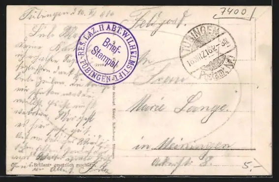 Personenbezogene Daten auf der Rückseite der Karte wurden durch blauen Textmarker unkenntlich gemacht. Die blauen Stellen sind auf die Vorderseite durchgeweicht und wirken sich negativ auf das Postkartenfoto aus