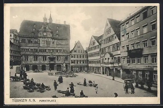 AK Tübingen, Partie am Marktplatz mit Brunnen und Warengeschäften
