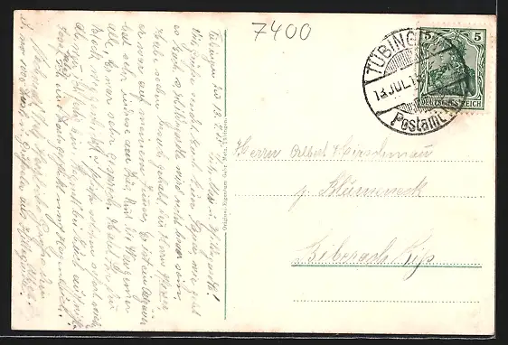 Personenbezogene Daten auf der Rückseite der Karte wurden durch blauen Textmarker unkenntlich gemacht. Die blauen Stellen sind auf die Vorderseite durchgeweicht und wirken sich negativ auf das Postkartenfoto aus