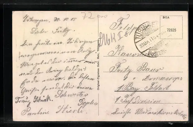alte Ansichtskarte, gelaufen als Feldpost 1915, Bugspur oben, guter Zustand