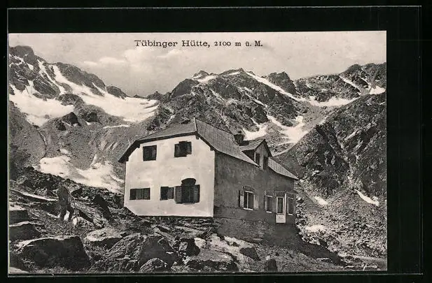 AK Tübinger Hütte, Berghütte vor Gebirgspanorama